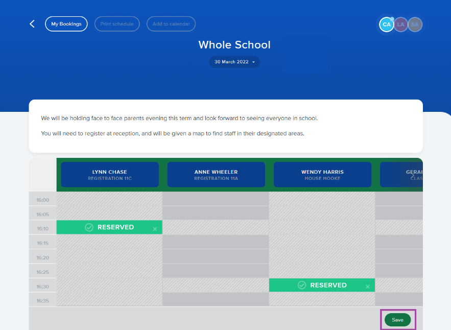 Find the teacher and time you’d like to book and click to reserve the time slot. The selection will show in green with the word “RESERVED”. The time allocated for each slot will be automatically populated.